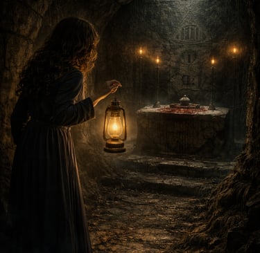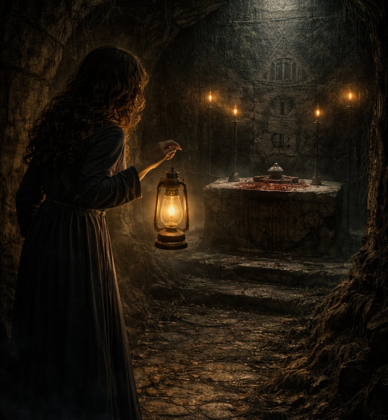At the bottom lay a chamber carved into the earth. Symbols were etched into the walls, their meanings lost to time but heavy with menace. In the center stood a stone altar, stained dark as though it had absorbed centuries of offerings. Evelyn’s lantern dimmed, and she felt the air thicken, pressing against her lungs. The chamber seemed to pulse, as if it had a heartbeat of its own.