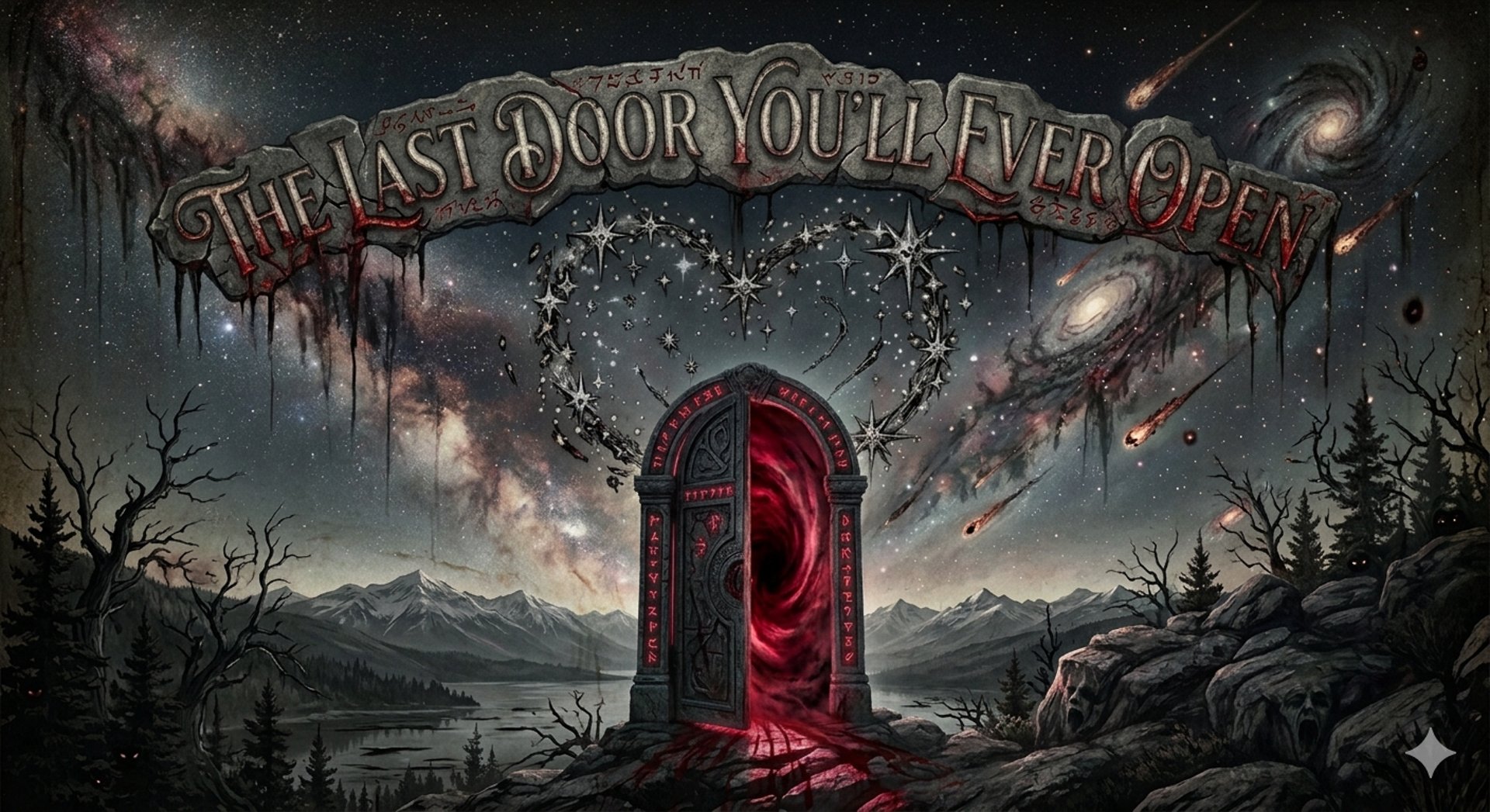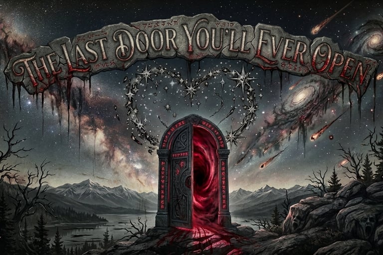 The door stood like a wound in the world, its frame bleeding with runes that pulsed as though alive. The lake behind it reflected not the stars above but twisted galaxies, spiraling into shapes that resembled screaming mouths. The inscription carved above dripped shadows that writhed like worms, spelling out a promise Elias could not ignore: The Last Door You’ll Ever Open.