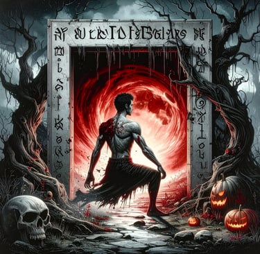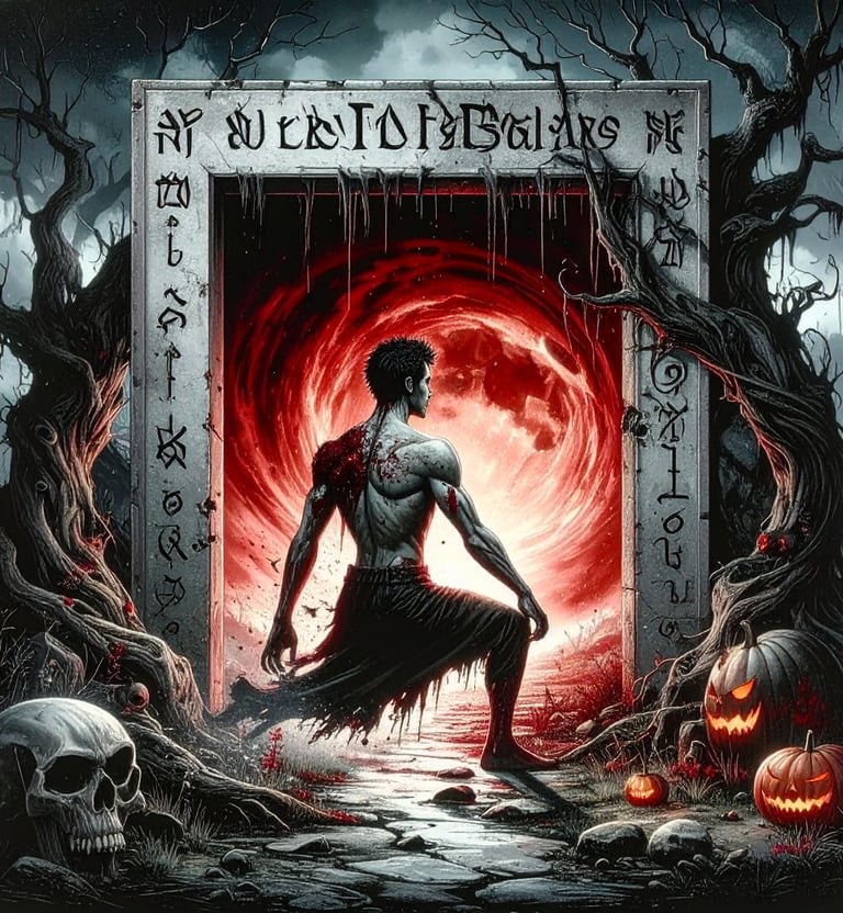 The runes on the frame flared, searing his skin as he reached out. Black ichor dripped from the inscription above, staining his shoulders, soaking into his clothes. He tried to step back, but the ground cracked beneath him, releasing whispers from the earth. The trees leaned closer, their branches curling like claws, their carved faces twisting into grins.
