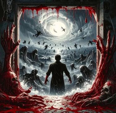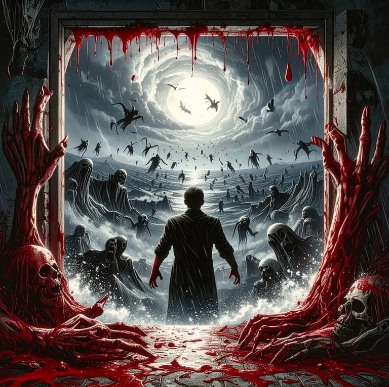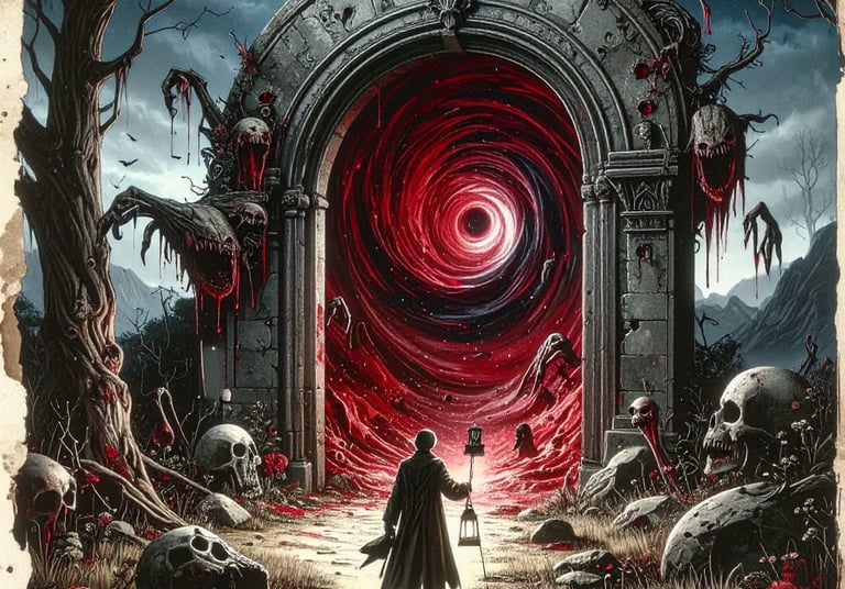 The vortex within the door churned crimson, a storm of blood and ash. Shapes writhed inside—limbs, faces, fragments of bodies torn apart and reassembled. They beckoned with skeletal hands, their mouths opening in silent screams that somehow echoed in his skull. Elias felt his name whispered from every direction, a chorus of voices that knew him better than he knew himself.