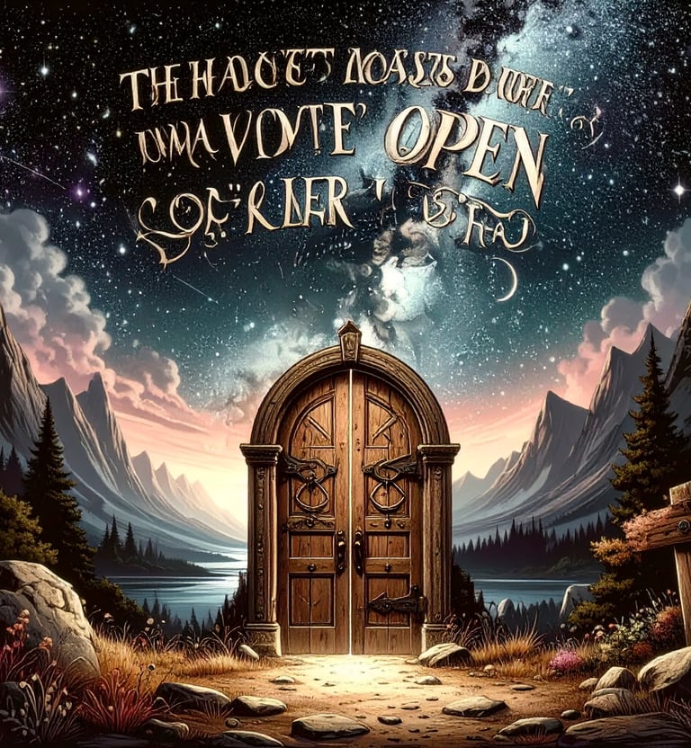The door closed behind him with a groan, sealing the world outside. The runes dimmed, waiting for the next wanderer. Above, the inscription gleamed once more: most of it twisted into an unknown, ancient script no mortal could decipher—except for a single word that burned clear: OPEN. And the night grew darker, swallowing the stars, as though the universe itself had just devoured another soul.