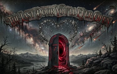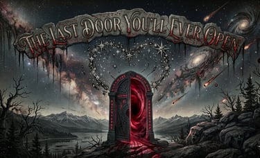A lone door stood on jagged rocks beneath a bleeding sky, its runes glowing like veins of fire and a crimson vortex swirling within. Elias, drawn by whispers that knew his name, stepped closer as twisted trees leaned in and pale faces rose silently from the lake. Shadows clawed at him, the inscription above dripping black ichor onto his shoulders, until the door pulled him inside. He fell endlessly through storms of blood, seized by hollow-eyed souls screaming eternally, each face twisting into his own reflection. The voices spoke his sins and secrets, binding him to the abyss. Outside, the door closed, the runes dimmed, and the night swallowed another star, waiting for its next victim.
