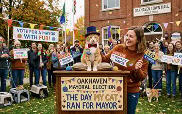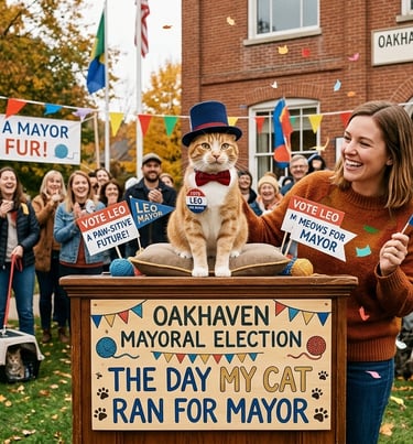 Leo, a ginger cat, climbed onto Oakhaven's town hall podium and sparked a movement. His owner Clara made a joke, but people took him seriously. The town square filled with laughter and excitement. Neighbors reconnected, shopkeepers showed kindness, and children drew paw prints. Leo's calm presence reminded everyone that leadership is about unity. The town transformed, becoming lighter and kinder. Election day didn't matter; Oakhaven had already changed. Leo reminded everyone that simple hearts can bring big change.