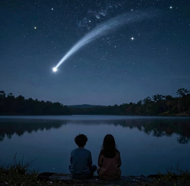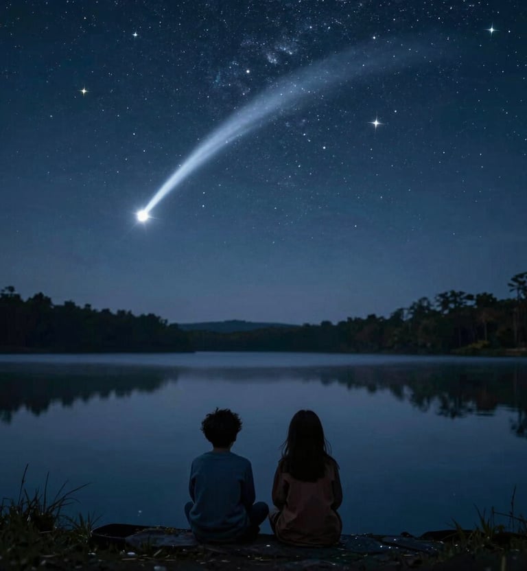Above them, the stars pulsed. One blinked brighter than the rest, then dimmed, as if shy. A comet sliced through the sky, trailing silver fire. The lake mirrored it all, turning the world into a canvas of light and longing.