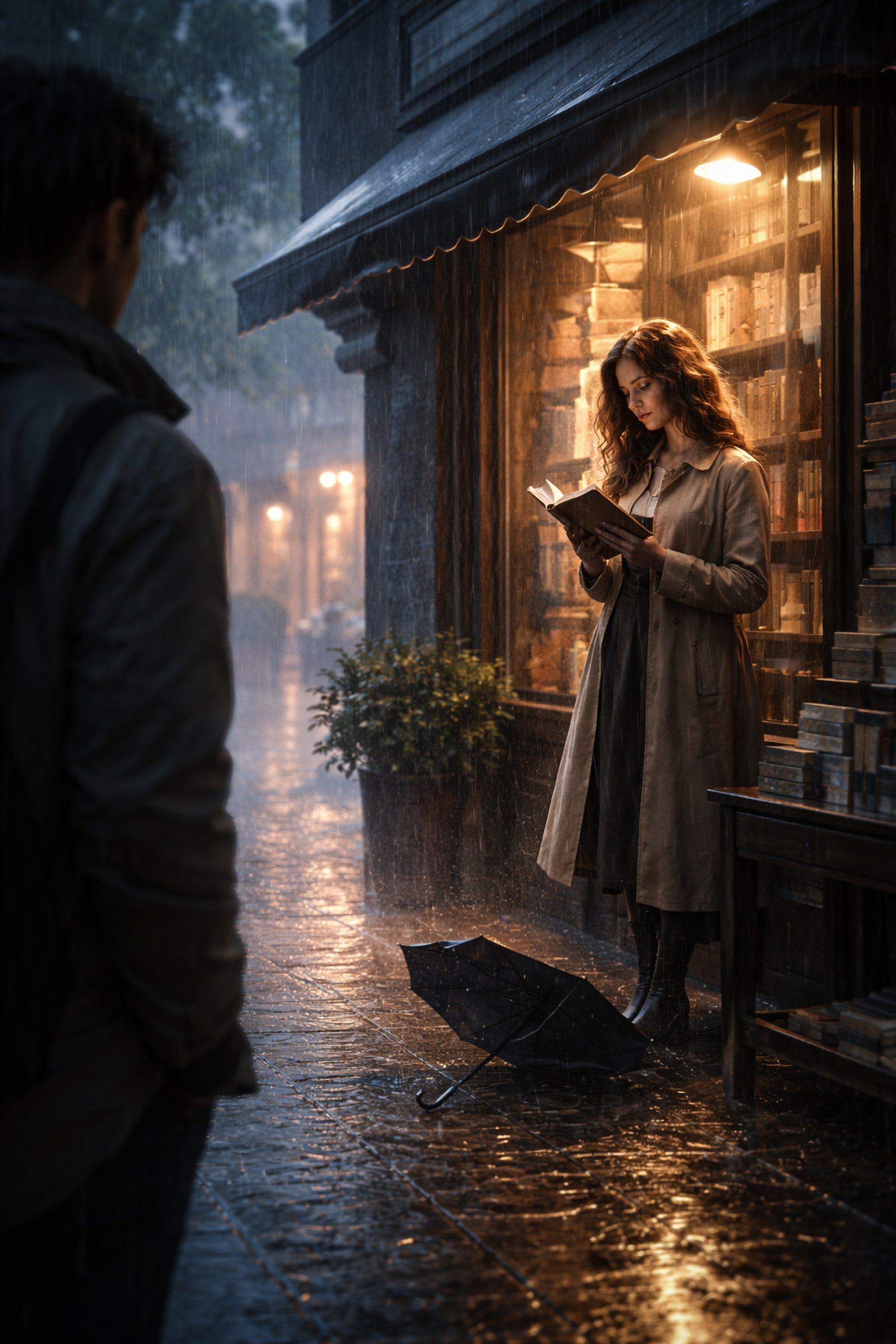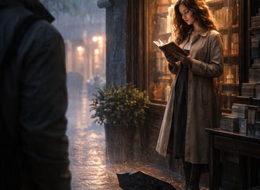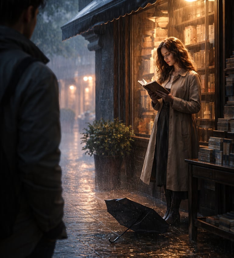 He lingered, hesitant, as though approaching her might shatter the fragile enchantment. Yet fate is bold where hearts are timid. A gust of wind carried his umbrella away, tumbling toward her feet. She bent to retrieve it, and when their eyes met, the storm outside seemed to pause, holding its breath.