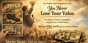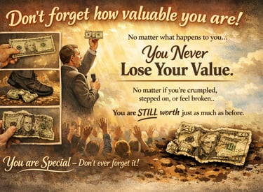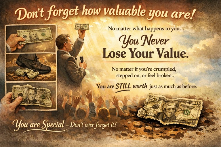 He picked it up, now all crumpled and dirty. "Now who still wants it?" Still the hands went into the air. "My friends, you have all learned a very valuable lesson. No matter what I did to the money, you still wanted it because it did not decrease in value. It was still worth $20. Many times in our lives, we are dropped, crumpled, and ground into the dirt by the decisions we make and the circumstances that come our way. We feel as though we are worthless. But no matter what has happened or what will happen, you will never lose your value. You are special - Don't ever forget it!